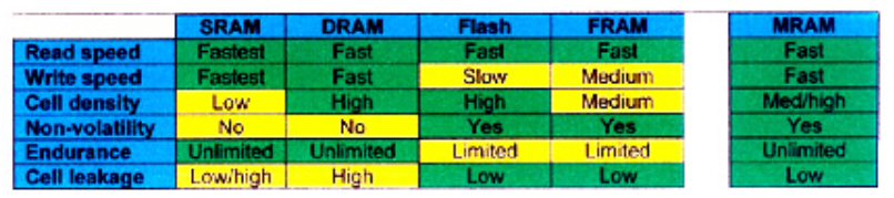 内存选项的比较与其他内存技术选项相比,MRAM具有明显的优势(下表1)。