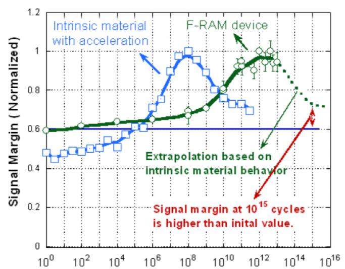 当前对0.13μm FRAM的1015个周期的耐用性规范基于对使用0.13μm技术节点构建的并行FRAM核心存储器产品的样本中1,280位FRAM存储器的初步评估。图1显示FRAM设备级信号容限在1012和1013个周期之间达到最大值。根据本征材料对0.13μm