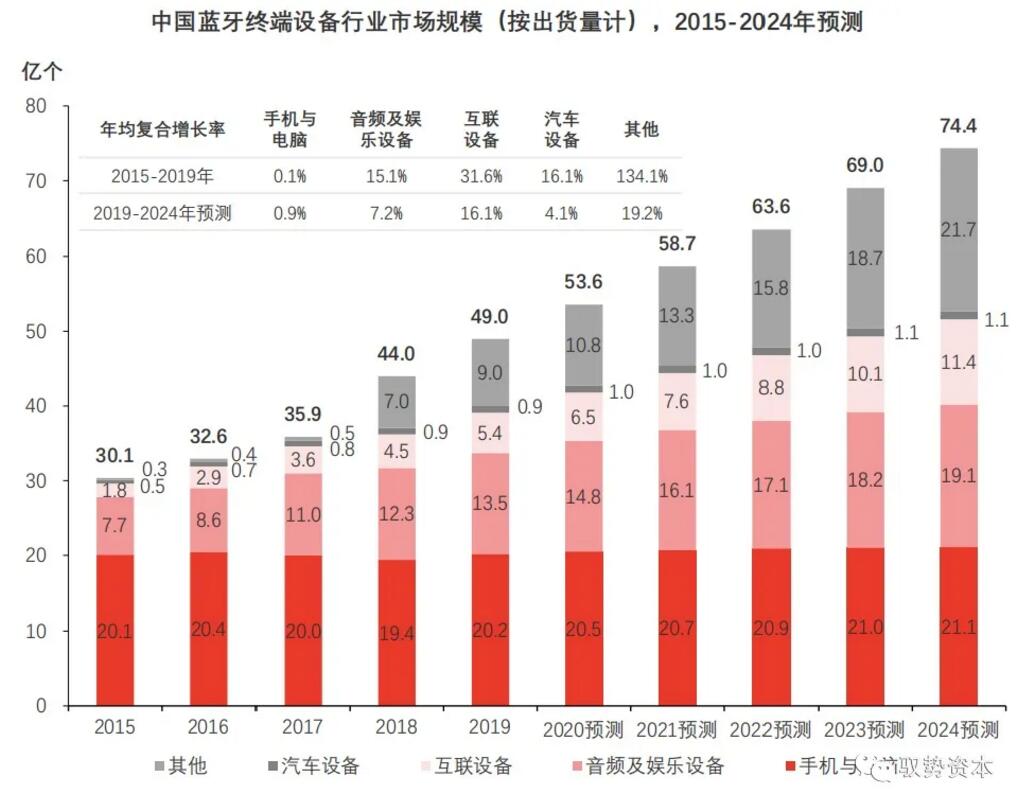 2015年至2020年期间中国蓝牙终端设备出货量稳步提升,未来伴随蓝牙芯片在各领域渗透率持续提升,预计至2024年蓝牙终端设备出货量将达74.4亿个。
