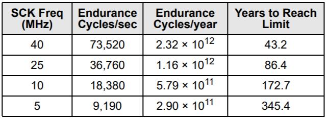 FeRAM存储器具有读取和还原机制。因此,对于存储阵列的每次访问(读取或写入),将按行施加耐久周期。 FRAM体系结构基于每个64位的16K行的行和列的阵列。整个行在内部访问一次,无论是读取还是写入一个字节或全部八个字节。在耐久性计算中,该行中的每个字节仅被计数一次。下图显示了一个64字节重复循环的耐久性计算,该循环包括一个操作码,一个起始地址和一个顺序的64字节数据流。这将导致每个字节在整个循环中经历一个持久周期。即使在40 MHz时钟速率下,FRAM的读写持久性实际上也是无限的。