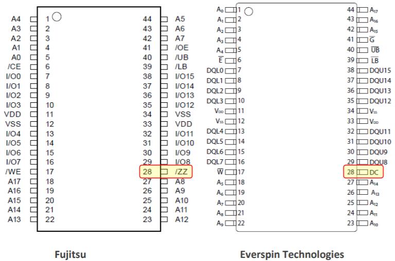 MRAM,组织为256kx16,由标称3.3V电源供电,并与FRAM兼容。两款产品均使用标准SRAM并行地址(A0-16)、字节宽双向数据引脚(DQ0-7)和控制信号(/E、/W、/G)。每个都可以由一个公共定时接口支持,并将用作随机存取读/写存储器,在断电时无需外部电池即可保留数据。Everspin不支持/ZZ睡眠功能。/ZZ可能需要上拉。