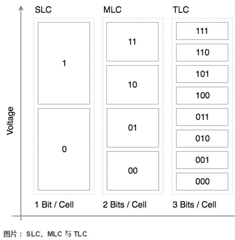 NAND FLASH的一个存储单元内部,是通过不同的电压等级,来表示其所存储的信息的。在SLC中,存储单元的电压被分为两个等级,分别表示0和1两个状态,即1个比特。在MLC中,存储单元的电压则被分为4个等级,分别表示00011011四个状态,即2个比特位。同理,在TLC中,存储单元的电压被分为8个等级,存储3个比特信息。