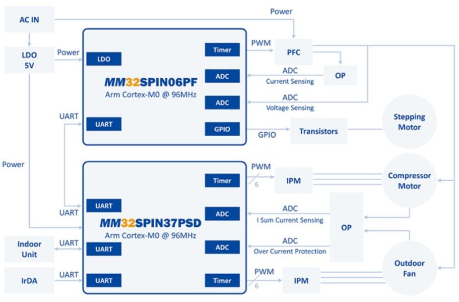 MM32SPIN06微控制器的空调外机方案如下图所示,其中MM32SPIN37PSD(2个ArmCortex-M0内核,最高主频96MHz)和MM32SPIN06PF(基于ArmCortex-M0内核的高性能32位微控制器,最高工作频率可达96MHz)为主控制器。