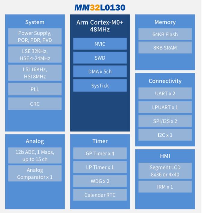 上海灵动微电子低功耗MM32L0130系列MCU产品搭载ArmCortex-M0+处理器,集成段码LCD驱动,功耗可低至100nA,适用于多种低功耗应用场景。