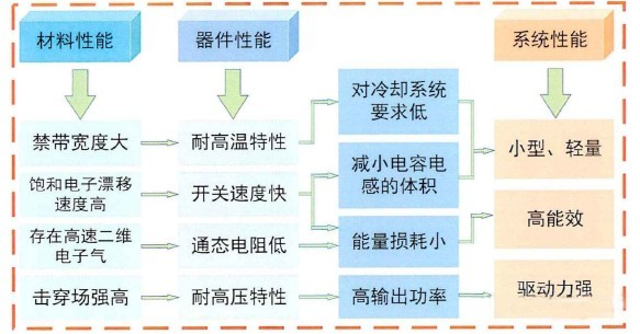 相比主流的第一代半导体——硅材料,碳化硅的禁带宽度是硅的3倍;导热率为硅的4-5倍;击穿电压为硅的8-10倍;电子饱和漂移速率为硅的2-3倍。
