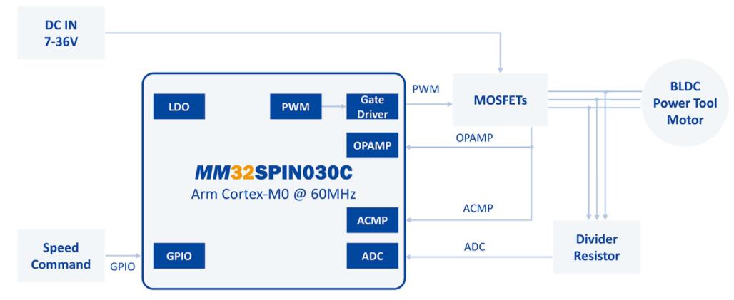 MM32SPIN030C,Arm® Cortex-M0内核,最高工作频率可达60MHz,内置存储器32KB Flash和4KB SRAM,具有1 路 12 位模数转换器 ADC,支持 11 通道,采样速率 1Msps,4 个通用定时器,1 个针对电机控制的 PWM 高级定时器,支持 UART/SPI 通信,针对电机应用内置 2 个运放、2 个比较器,内置三相 P/N 栅极驱动器。
