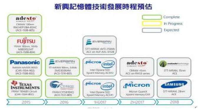 根据研究机构Tech Insights估计,包含FRAM、STT-MRAM、3D Xpoint 、CBRAM等新世代内存,都已陆续进入小量生产阶段。 不过,这些新兴内存技术中,除了少数存储芯片例外,要发展到能跟NAND Flash、DRAM不相上下的程度,恐怕还需要很长的一段时间,因为DRAM与NAND Flash已具备极为庞大的经济规模,即便新兴内存技术在性能方面明显优于现有内存,在供货稳定度、成本方面也未必能与现有内存技术相抗衡。