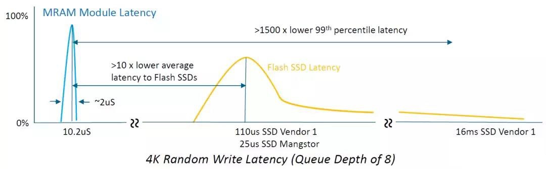Everspin科技公司目前是全球第一家提供MRAM存储芯片产品,目前推出最新款的产品STT-MRAM产品,单颗芯片容量可达32MB,可以做SSD固态硬盘的缓存绰绰有余,如下图,MRAM的读写延迟只有10微秒左右,而且在命令很多的情况下,延迟QoS非常稳定,波动在2微秒之内。而SSD的延迟在100微秒,同时命令多了之后,延迟更长。