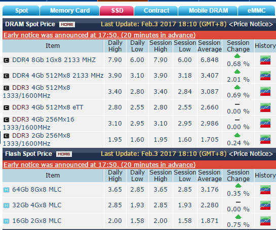 内存涨价已经是2016年下半年来的主流趋势,2017年开年也是如此,而且本季度涨的可能更凶了,从Dramxchange的统计数据来看,1月份以来4Gb DDR4颗粒价格飙升0.51美元,涨幅18%,截至2月3日4Gb DDR4颗粒的高位价格达到了3.9美元,平均也有3.4美元,这是2015年7月30日以来的新纪录,创下18个月来新高。