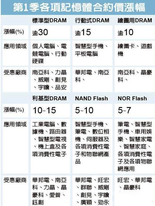 今年存储芯片缺货效应持续扩大,继DRAM、储存型快闪存储(NAND Flash)在淡季飙出历年最大涨幅后,编码型快闪存储(NOR Flash)也在睽违四年多来初次提价,第一季度调涨5~7%不等,下季涨幅更大,估计涨幅逾10%。