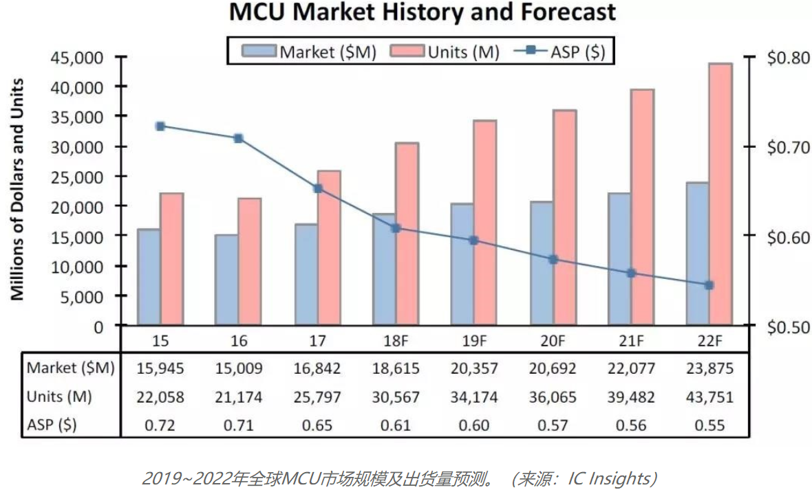 据IC Insights研究报告预测,2019年全球MCU市场规模将达204亿美元、出货量达到342亿颗,不过平均售价(ASP)将持续下降。