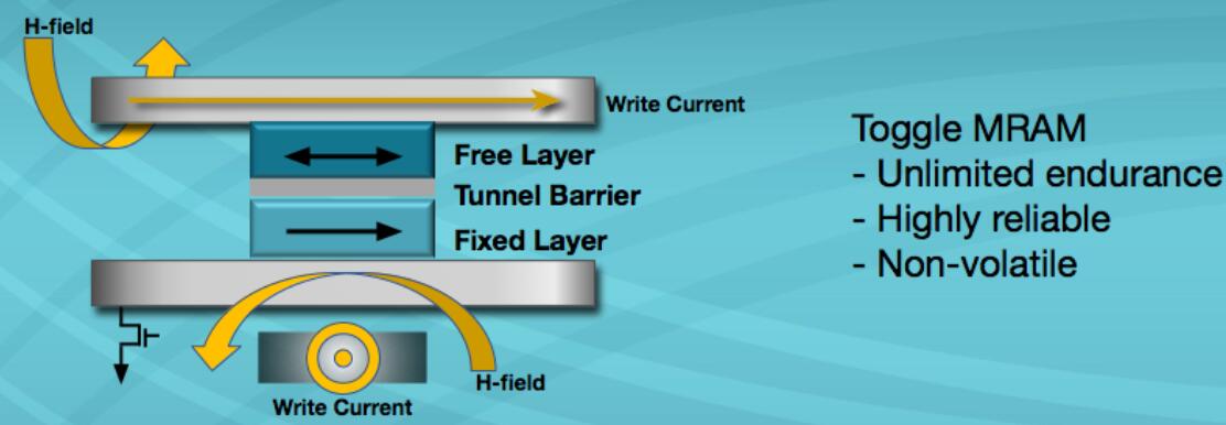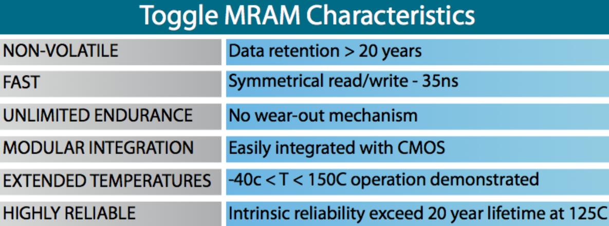 切换MRAM使用1个晶体管,1个MTJ单元来提供简单的高密度存储器。Everspin使用获得专利的Toggle电池设计,可提供高可靠性。数据在温度下20年始终是非易失性的。