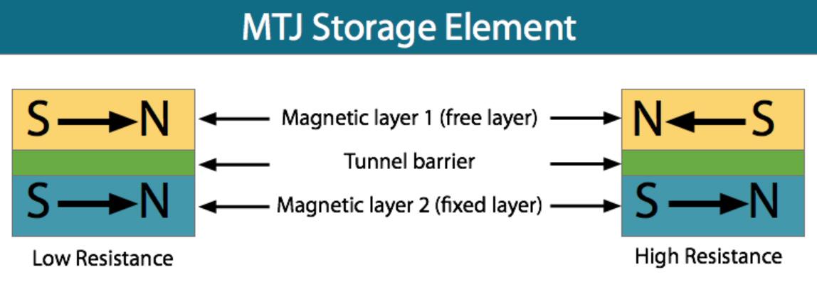 当自由层的磁矩平行于固定层时,MTJ器件具有低电阻,而当自由层磁矩与固定层矩反平行时,MTJ器件具有高电阻。
