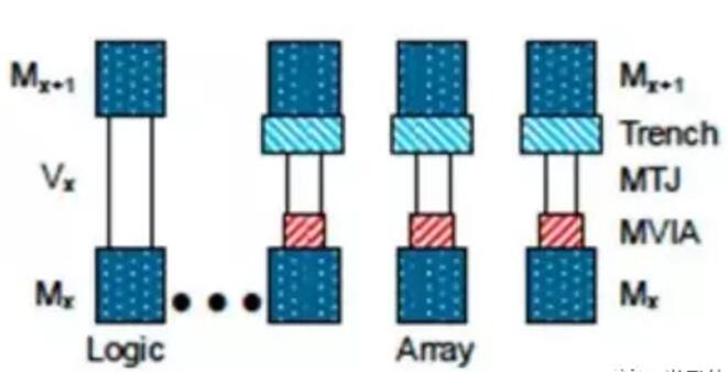 图2显示了1 Gb阵列中的pMTJ位以及芯片的BEOL金属化中的相邻逻辑区域的集成。
