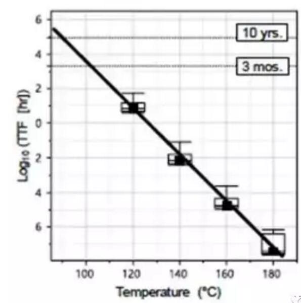 图3.一组1Gb裸片的数据保留(DR)烘烤的失效时间与温度的关系。实线拟合表示在85°C情况下为10年的DR,在100°C情况下为3个月的DR。
