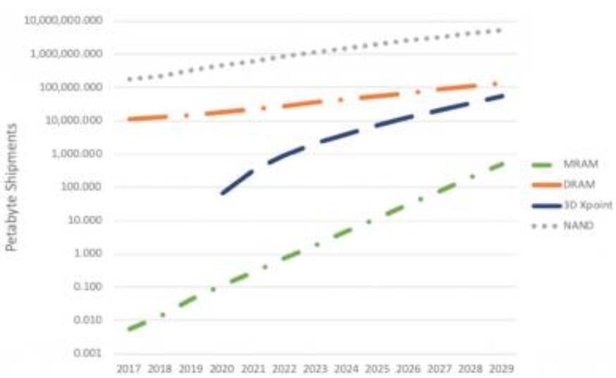 MRAM容量出货量预测(2017-2029,Coughlin)分析人士预计,包括DRAM,3DXpoint和NAND在内的许多存储技术将在未来几年内增长,但增长最快的将是MRAM存储器。容量方面的出货量预计将从2019年的约0.1PB增长到2029年的近100PB。