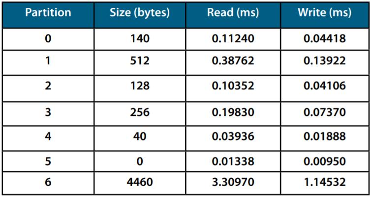 MRAM低级驱动程序通过操作系统和调度程序集成到动力总成应用程序中。读写周期由系统时钟(300MHz)测量。图1&2显示了针对动力总成应用的具有不同非易失性存储器接口的每个分区的读/写时间。这些表显示大多数读/写周期小于2ms。毫不奇怪,该表确认35ns并行接口以比40MHz