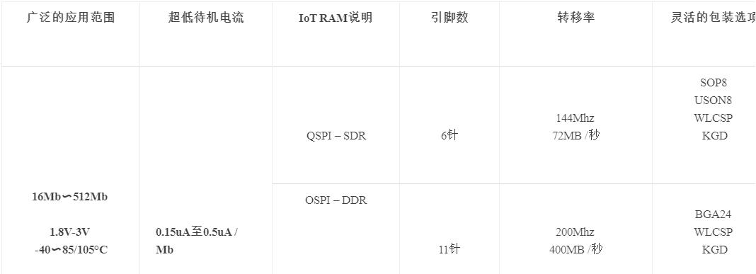 ram替换DRAM,消除了对外部刷新控制器的需求,这降低了接口的复杂性和相关的验证成本,利用了外部SPI接口的使用,同时保持了最新IoT应用程序所要求的高性能水平,并降低整个系统的功耗。有些基于MCU的旧系统仍在使用SDRAM,在降低功耗和简化接口方面,可以受益于IoT RAM的使用。下表清楚显示了待机电流和有功电流的优点,同时保持了相当的传输速率。