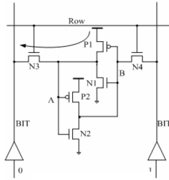 在六管单元的写操作中,外部电路驱动两个互补的信号到位线BIT 和BIT_上,字线驱动器驱动字线ROW 到高电平,位线信号经两个传输管写入存储节点。如图3.6 所示的正是向存有“1”的单元写“0”的情况,也就是把A 点的电平由VDD 下拉至GND。