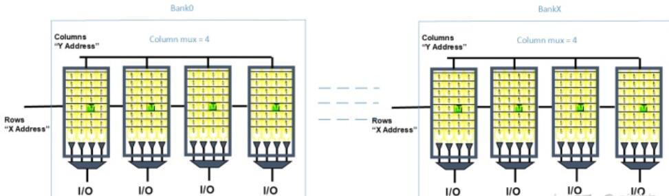 这些SRAM cell集合成如下图的多个bank的memory block,每个bank有bank address使能;在一个bank内Row address选择一个完整的wordline,Column address选择某组IO bitlines。