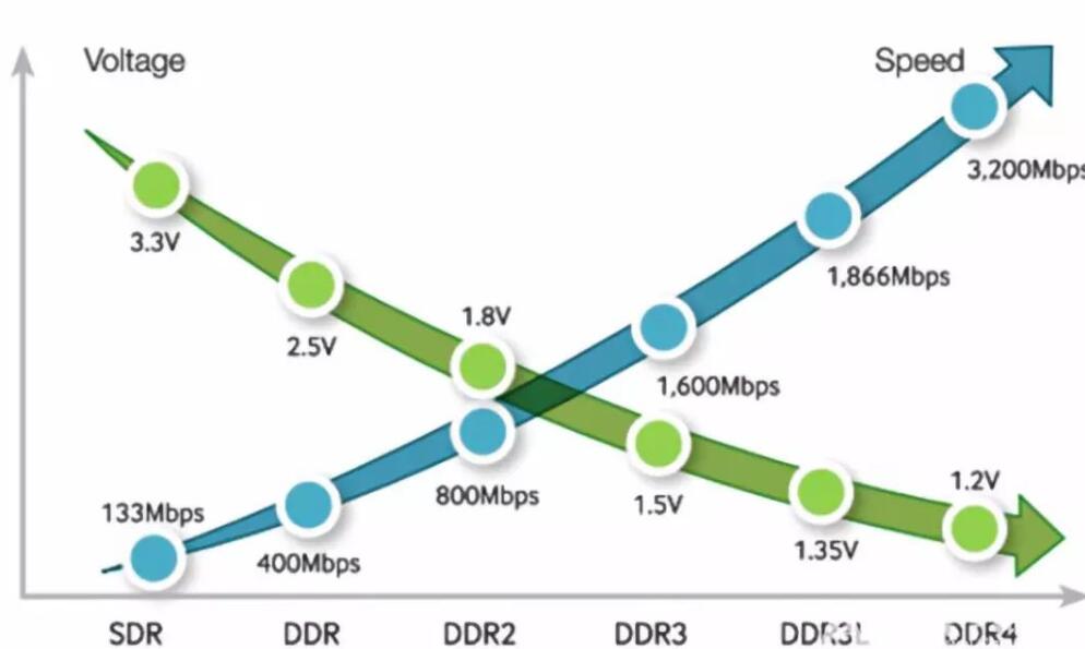 从DDR到DDR4,不同性能参数差异主要体现在2个地方:电源电压、数据传输速率。电源电压值越来越低,而数据传输速率却是呈几何倍数增长。