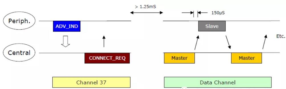 低功耗蓝牙芯片特有的设计,也是其快速建立连接的基础。低功耗蓝牙设备之间建立连接的过程如下: