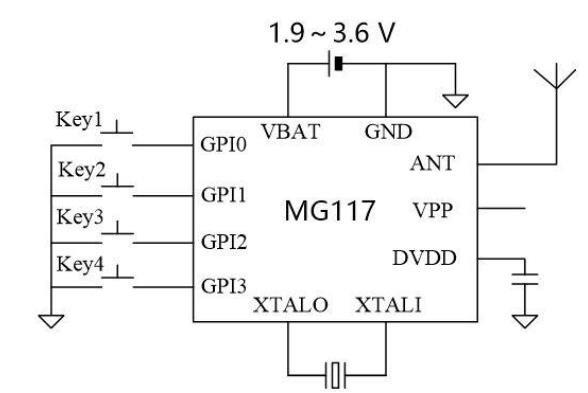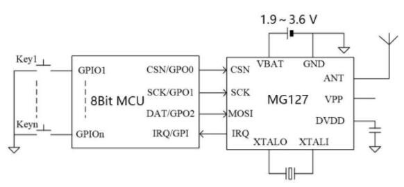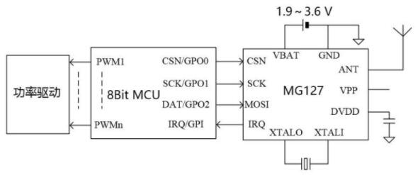 蓝牙芯片MG127是具有低功耗、低成本的BLE 收发器,内部集成了发射机、接收机、GFSK 调制解调器和BLE 基带处理。电源电压1.9~3.6,可以采用一个纽扣电池(3.0v)供电,具备3uA待机电流,20mA@0dBm持续发射,18mA持续接收等特点。MG127 采用DFN3x3 封装,只需搭配低成本MCU 和少数外围被动器件,即可实现BLE 遥控、蓝牙电子秤等应用。