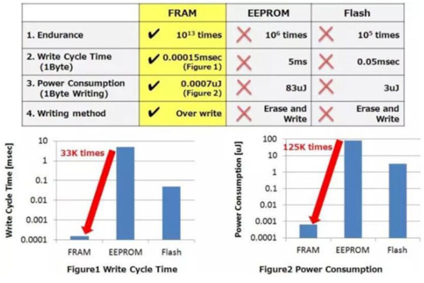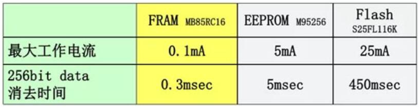 FRAM、EEPROM、FLASH工作电流与消去时间对比