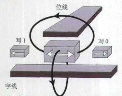 MRAM单元自由层产生的合成磁场来实现。在运行时,利用编码排序使二维MRAM阵列中只有一条字线和一条位线通过电流(如图1),因而只有一个MRAM单元被选中,这时可以有两种写人状态: