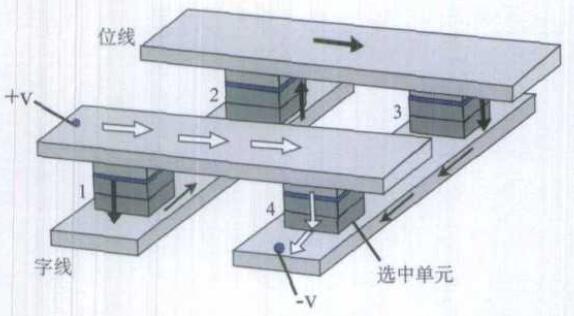 图4给出由4个MRAM单元组成的删格,在一条位线和一条字线加上电压后,由图可见被选中的是4号MRAM单元,这时电流从‘+V’电极流至‘-V’电极可以有两条通道。