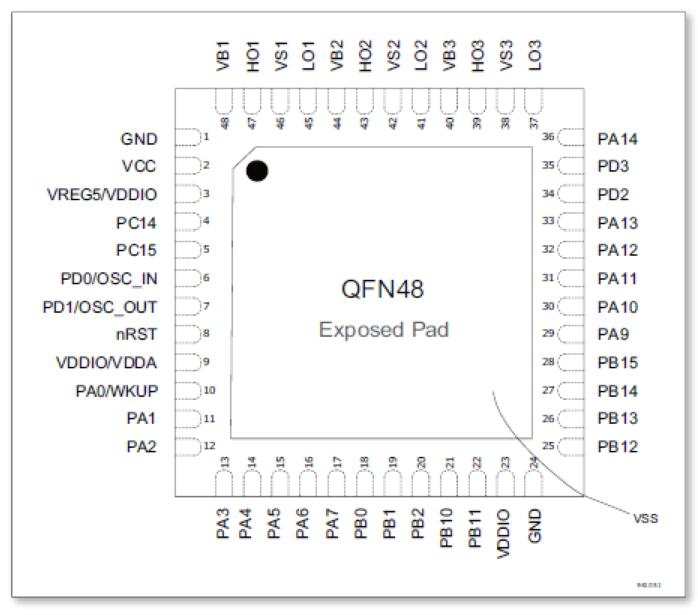 国产32位单片机MM32SPIN360C拥有M0内核的高性能32位微控制器,5V输出的LDO稳压器、三组具备有自举二极管的N通道半桥栅极驱动器。MCU最高工作频率可达96MHz,并内置SRAM高速存储器,增强丰富型I/O端口和外设连接到外部总线。采用QFN48封装形式。本产品包含2个12位的ADC、3个比较器、3个运算放大器、1个16位通用定时器、1个32位通用定时器、3个16位基本定时器、2个16位高级定时器。还包含标准的通信接口:1个I2C接口、1个SPI接口和2个UART接口。