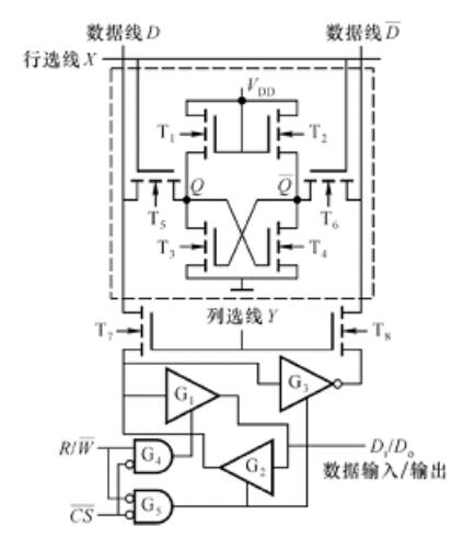 其中存储单元通过T5、T6和数据线(位线)相连;数据线又通过T7、T8和再经输入/输出缓冲电路和输入/输出线相连接,以实现信息的传递和交换。写入信息的操作过程,在第一次写入信息之前,存储单元中的信息是随机信息。