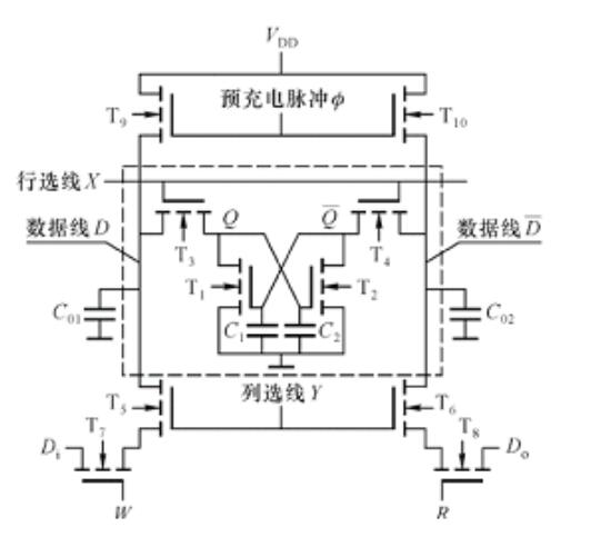 补充充电的过程:加预充电脉冲∅、预充电管T9、T10导电,CO1,C02很快充电至VDD,∅撤销后,CO1,CO2上的电荷保持。然而进行读出操作:地址有效,行、列选线X、Y高电平;R=1,W=0进行读出操作,如果原信息为Q=“1”,说明MOS电容C2有电荷,C1没有电荷(即T2导电,T1截止);这时CO1上的电荷将对C2补充充电,而CO2上的电荷经T2导电管放掉,结果对C2实现了补充充电。读出的数据仍为,