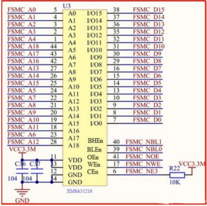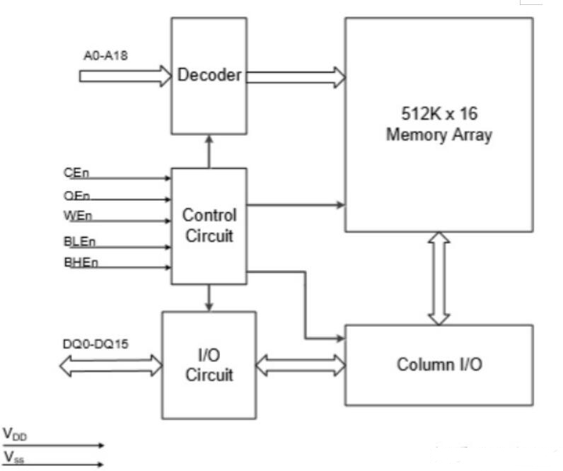 图中A0~18为地址线,总共19根地址线(即2^19=512K,1K=1024);DQ0~15为数据线,总共16根数据线。CEn是芯片使能信号,低电平有效;OEn是输出使能信号,低电平有效;WEn是写使能信号,低电平有效;BLEn和BHEn分别是高字节控制和低字节控制信号;