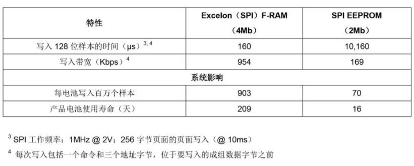 FRAM和EEPROM写入数据所需的能量。可以看出对于这种应用而言,FRAM消耗的功耗显著降低。极低功耗深度待机模式和休眠模式可进一步改善功耗,从而进一步延长设备的电池使用寿命。