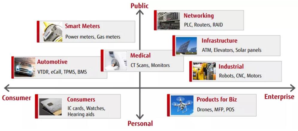 经过市场的长期广泛验证以及技术的不断突破,富士通FRAM产品已成功应用于智能卡及IC卡等卡片领域、电力仪表及产业设备等工业领域,医疗设备及医疗RFID标签等医疗领域、胎压监测及新能源汽车电池管理系统等汽车领域等等,涉及的应用超过200种,几乎覆盖所有主要领域!