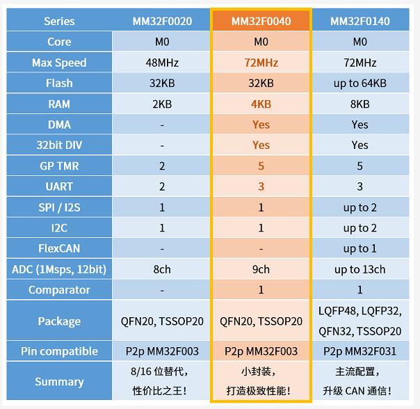 灵动微电子MM32F0040与MM32F0020,MM32F0140的功能对比