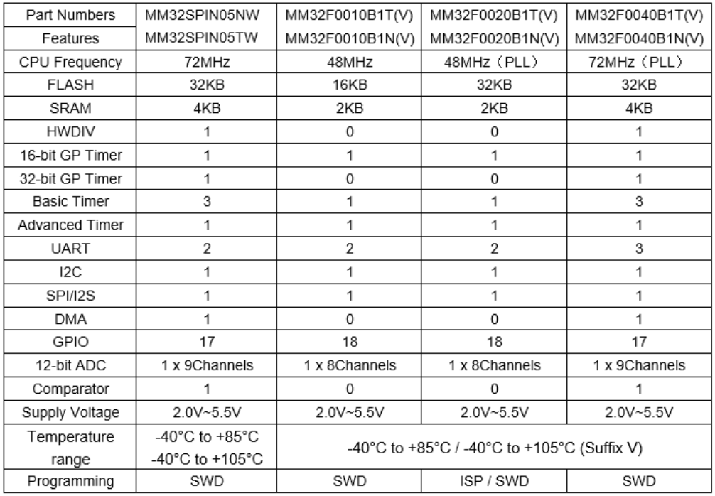 MM32F0020 的封装相同,但在性能和外设上还是有不少不同之处的,部分可以参照下表所示。此外 MM32F0040 还增加了 MM32F0020 所不具有的外设功能,比如硬件除法器、比较器、32 位定时器等。所以项目之初做好评估,在硬件设计时做好兼容,在替换的时候,需要结合项目实际的硬件需求,做好对比;满足条件的情况下,可以进行升级。更多详情可咨询灵动微官方代理商英尚微电子。