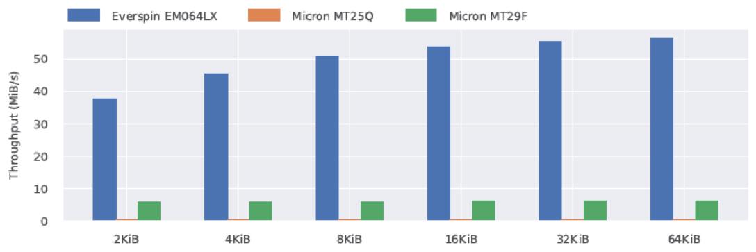 对于每个芯片,读取/写入64MiB的数据,从地址0开始,到地址8388608(8MiB)结束。我们对各种访问大小重复该过程:2KiB、4KiB、8KiB、16KiB、32KiB和64KiB。在闪存中,每个块在写入第一页之前都会被擦除。擦除时间包括在写入吞吐量测量中。