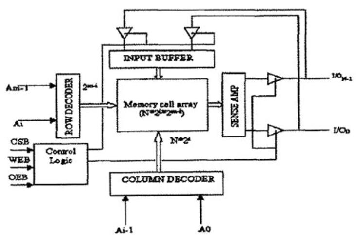由上图看出SRAM一般由五大部分组成,即存储单元阵列、地址译码器(包括行译码器和列译码器)、灵敏放火器、控制电路和缓冲/驱动电路。在图中A0-Am-1为地址输入端,CSB. WEB和OEB为控制端,控制读写操作,为低电平有效1100-11ON-1为数据输入输出端。存储阵列中的每个存储单元都与其它单元在行和列上共享电学连接,其中水平方向的连线称为“字线”,而垂直方向的数据流入和流出存储单元的连线称为“位线”。