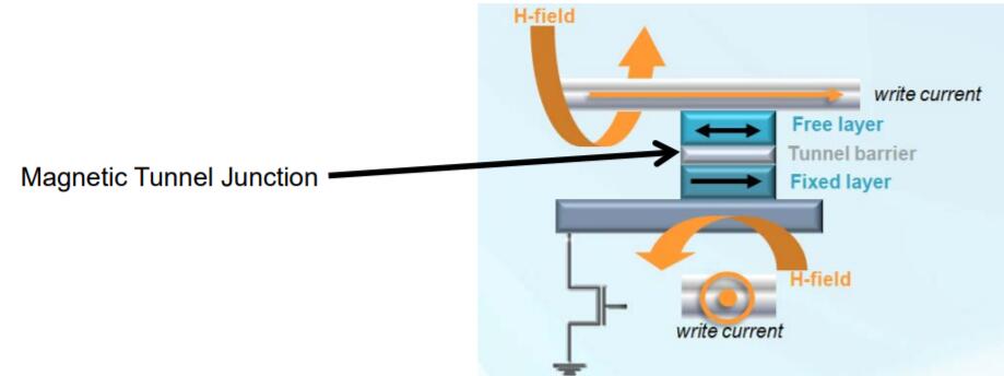 MRAM或磁性随机存取存储器使用1晶体管–1磁性隧道结(1T-1MTJ)架构,其中铁磁材料的磁性“状态”作为数据存储元素。由于MRAM使用磁性状态进行存储(而不是随时间推移而“泄漏”的电荷),因此