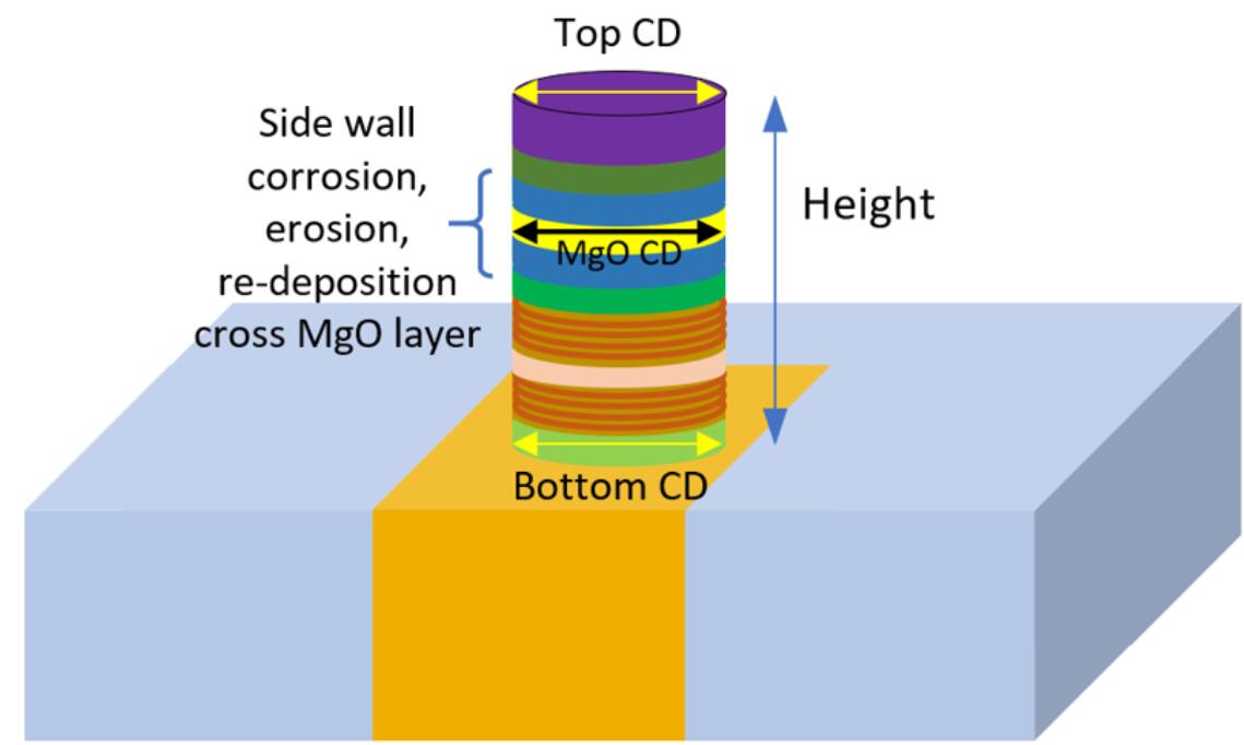 (4) MTJ柱图案化(参考图3):MRAM单元通常是直径约20~100nm的圆形柱。从光罩到光阻,从光阻到MTJ迭层的图案转移需要精确控制,从而使组件正常运作。透过非透明的MTJ堆栈进行微影迭对图案对准是一个挑战。离子束蚀刻必须保证支柱蚀刻后完好无损,并且在MTJ底部电极上停止蚀刻的同时,不会在其侧壁留下金属再沉积。蚀刻腐蚀、损坏和沿MgO暴露层的金属再沉积是关键问题,必须在此步骤中进行监控。监视和控制最终MTJ柱的高度和形状(主要是在MgO接口)以及柱的直径对于实现均匀的单元图案至关重要,这反过来又使得MRAM单元的开关分布最小化。最后,封装层覆盖了所有内容,以保护MTJ组件。该层必须毫无缺陷,并且其厚度必须满足规格要求。