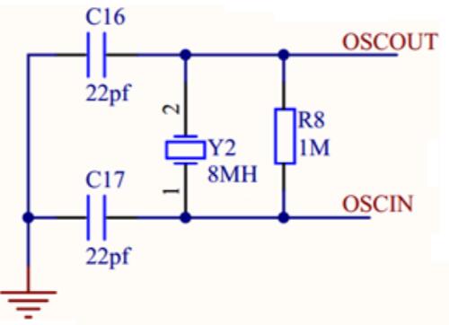 外部无源晶振电路如下图所示,晶振两脚接约 22pf 电容,并上 1M 反馈电阻。因芯片内部没有集成反馈电阻,为保证 XTAL 起振,必须接 1M 欧姆电阻;