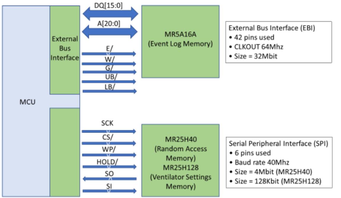 至少4Mb (MR25H40)的MRAM可用于存储操作软件程序变量。存储在MRAM的数据在呼吸机关闭期间保存。