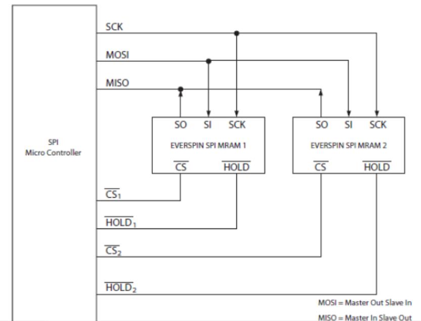 单个或多个器件可以连接到SPI总线,如下所示。引脚SCK,SO和SI是常见的设备。每个器件都需要分别驱动CS和HOLD引脚。